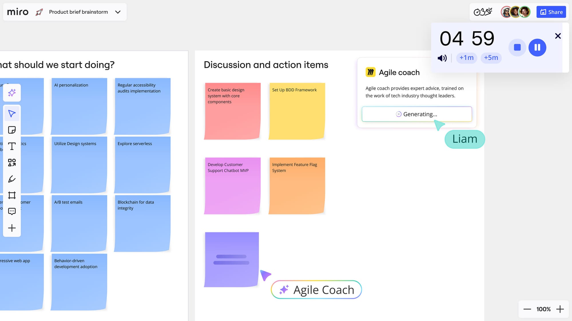 • AI Sidekicks: Receive contextual assistance from virtual experts such as Agile Coaches and Product Leaders, offering feedback and suggestions directly on your canvas.